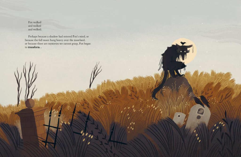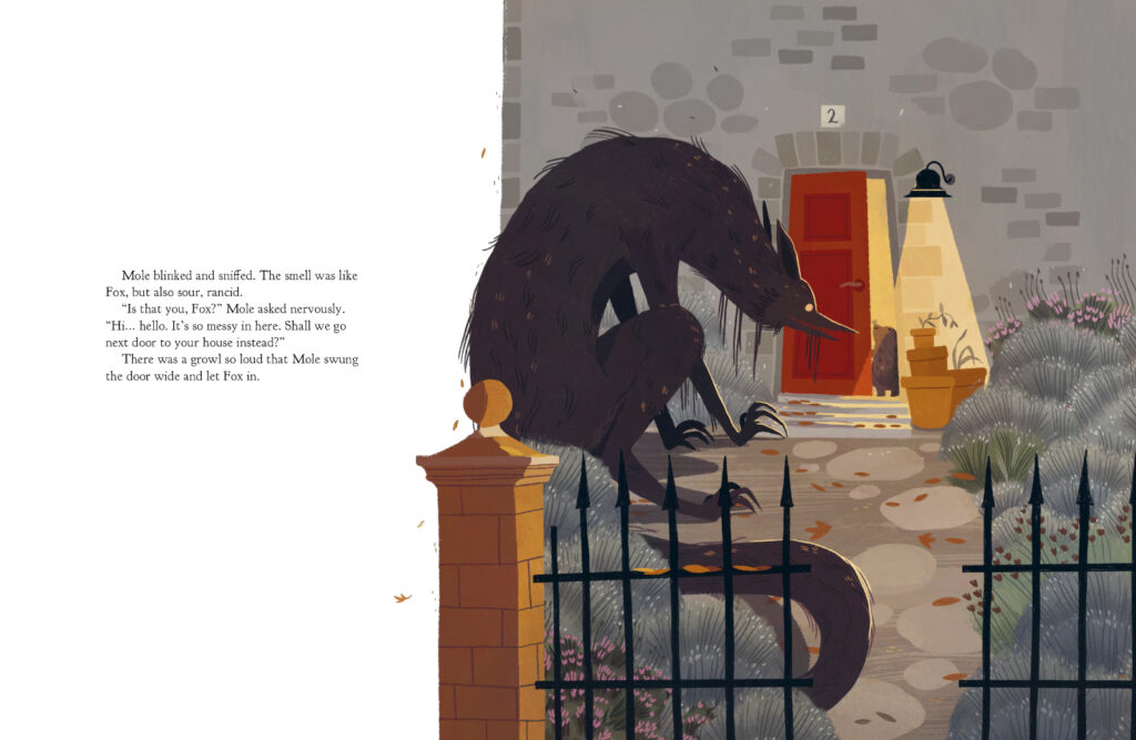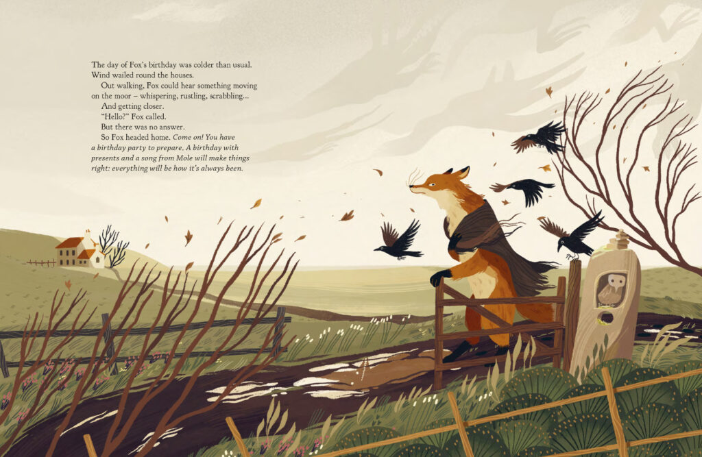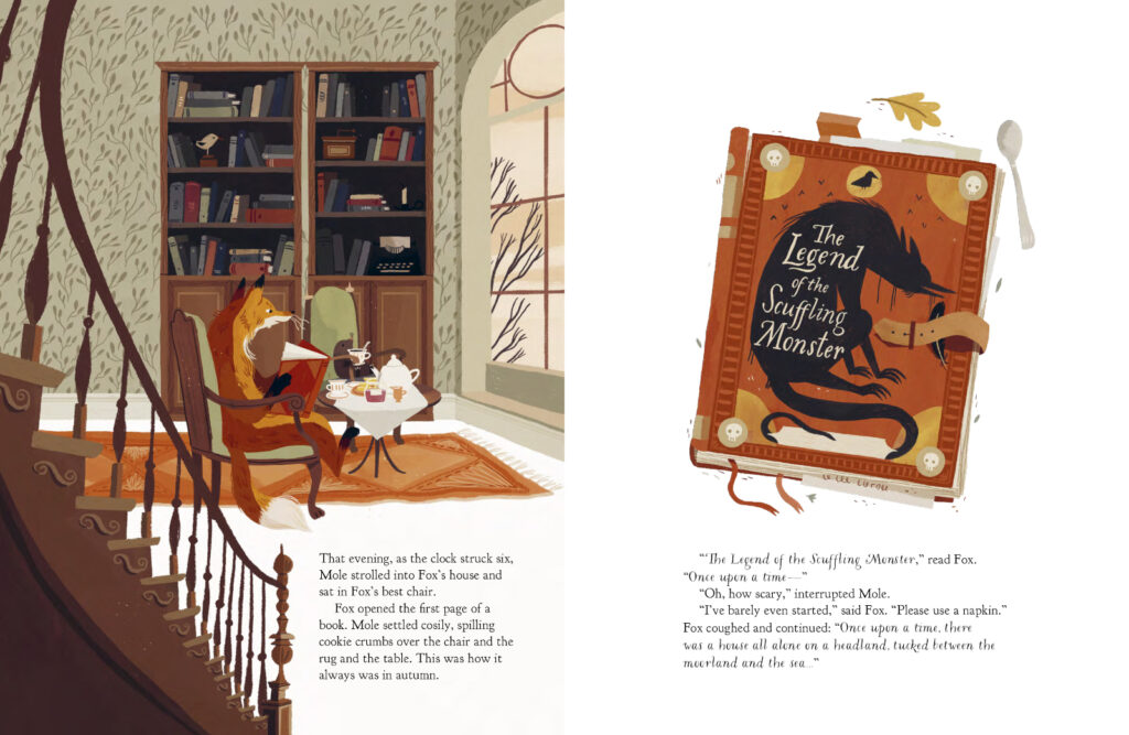 I don’t post a lot of picture books here, but seeing how it’s spooky season, I thought I would mention The Slightly Spooky Tale of Fox and Mole by Swedish illustrator Cecilia Heikkilä, published by Floris Books, which just landed on my desk at work. It’s an appropriately autumnal and windswept story about a dark and scuffling monster that emerges from the moor after Mole takes his friendship with his neighbour Fox for granted. As you can see below, the illustrations are wonderful and although things get a little scary in the middle, it all works out in the end.